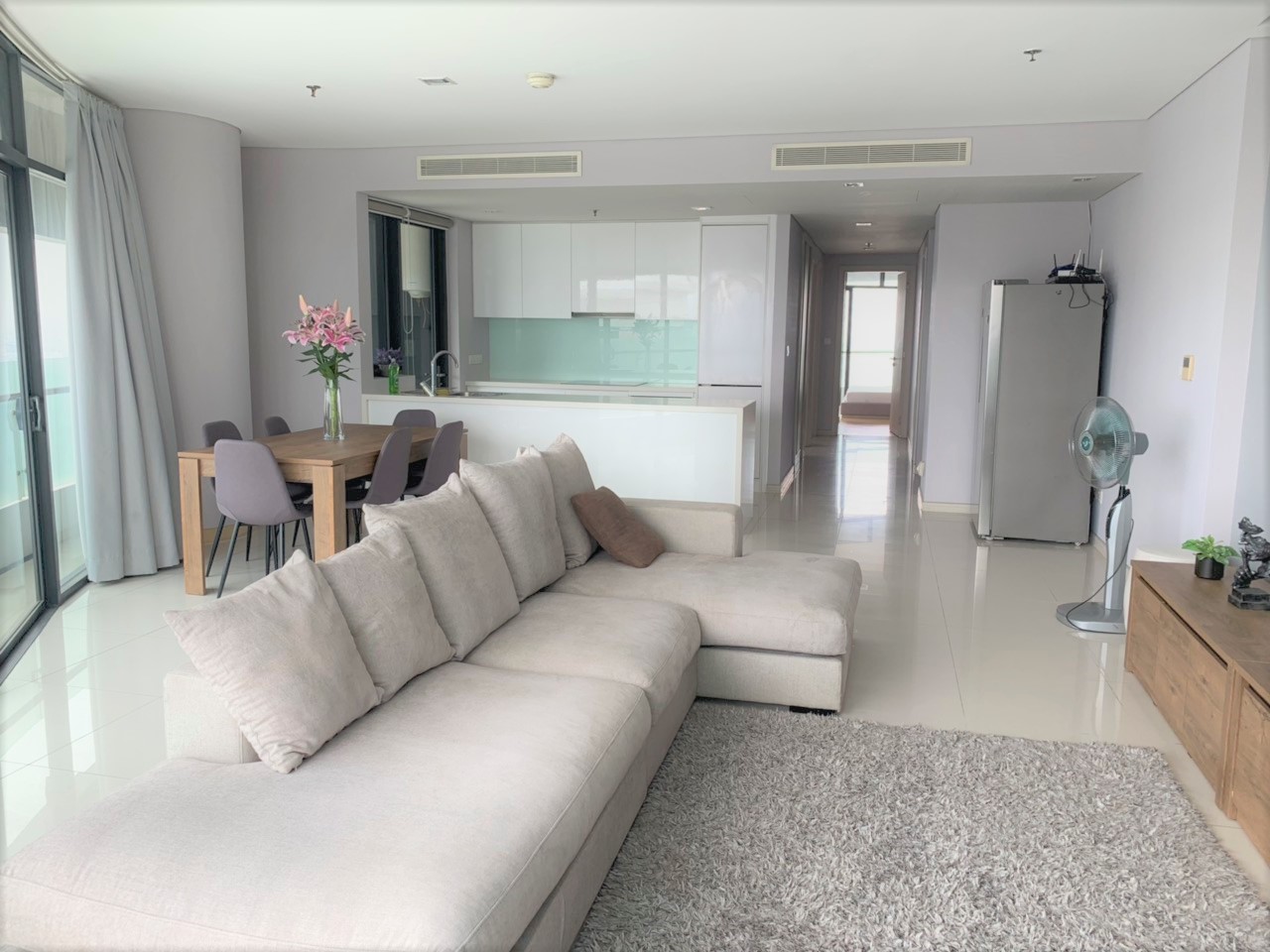 The 148 sqm apartment, which had been designed: living room, kitchen area, laundry, 3 bedrooms, 2 bathrooms. It had been set-up by high-end furniture. Such as: sofa, smart tivi at living room. Kitchen area: upper and lower cabinet, stove, oven, micro wave, washing sink, inverter fridge, washing machine. Bedroom: bed with mattess, storage, and bedside shelf…