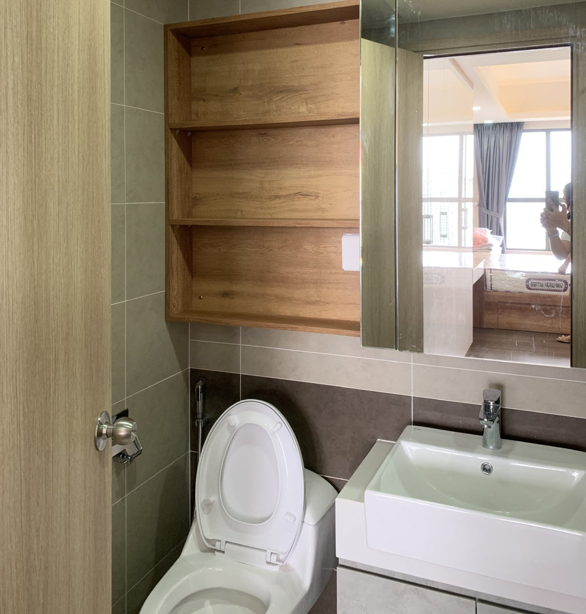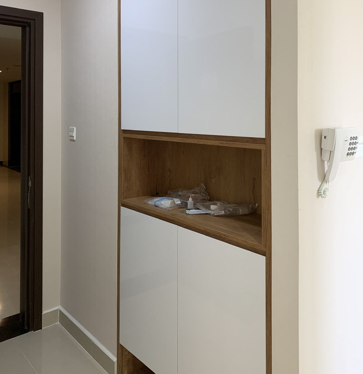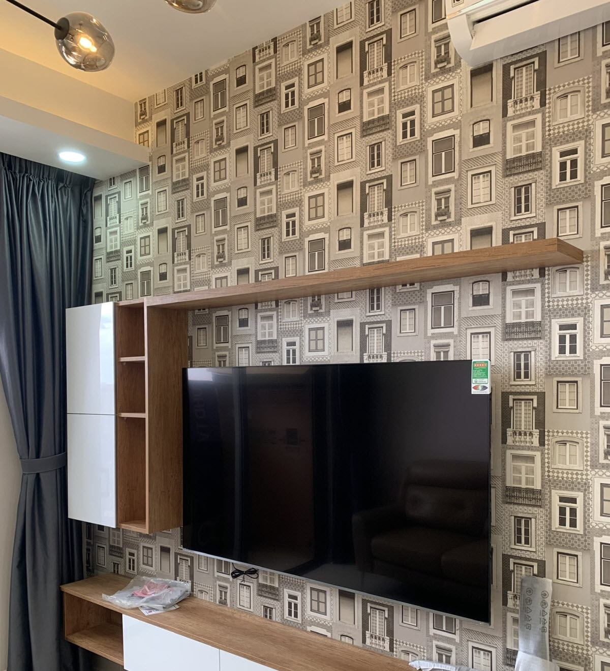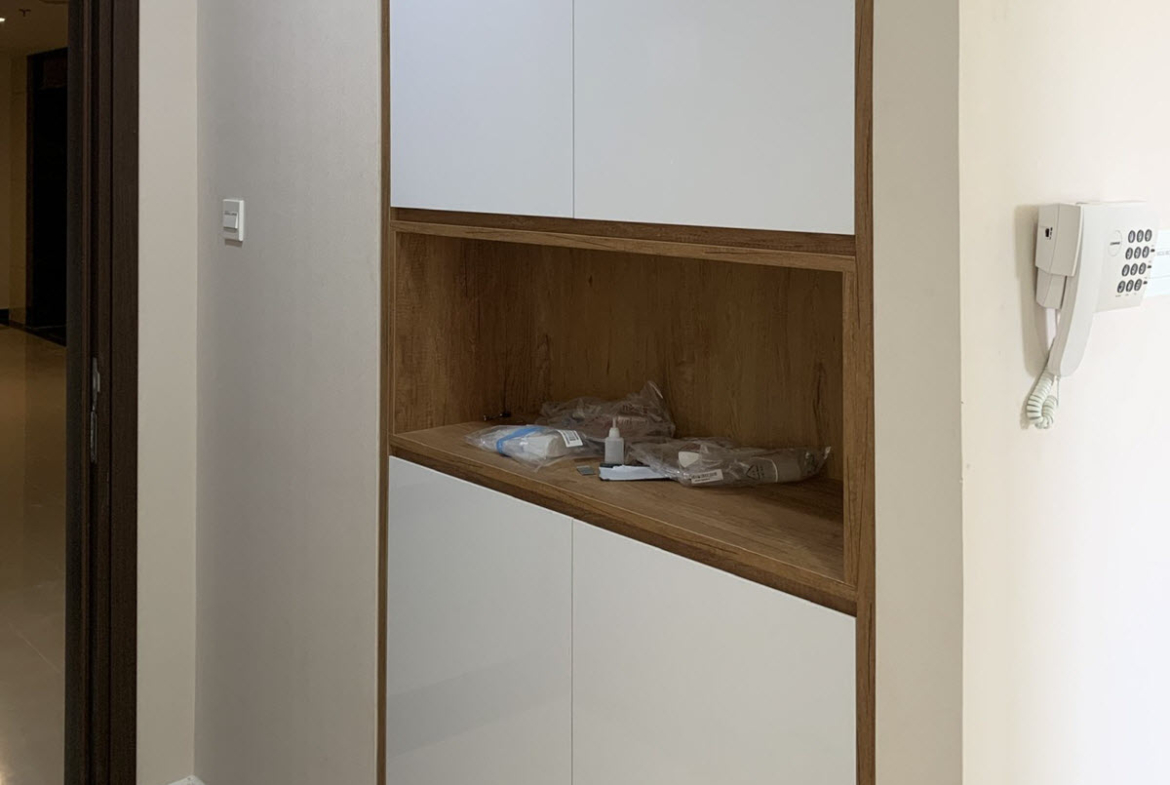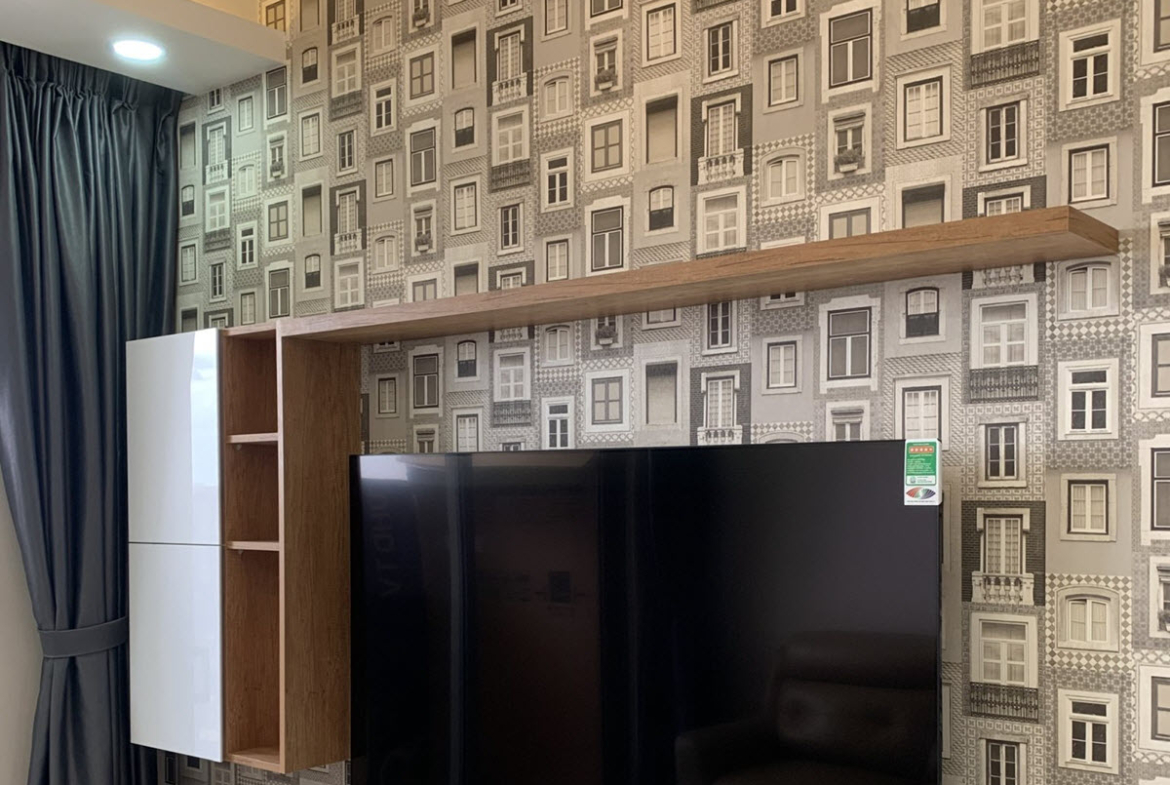 The entire apartment has been pasted with high-quality wallpaper, and fully furnished apartment with equipment such as sofa, smart TV, TV cabinet, decorative lights in the living room. Dining table with 4 chairs, kitchen top and bottom, electric stove, hood, microwave, side by side refrigerator in the kitchen area. Bedroom with mattress, wardrobe, dressing table. You just need to bring your suitcase and move in right away