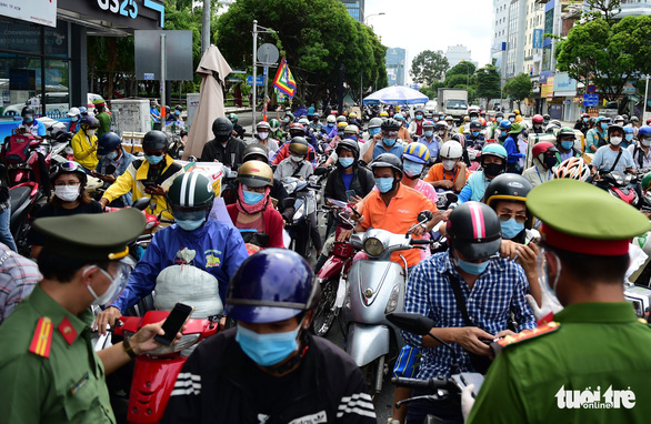 On Phan Dang Luu and Le Van Duyet Streets in Binh Thanh District, hundreds of motorbikes were seen struggling to inch toward the checkpoints, where officers were still strictly upholding the declaration protocol.